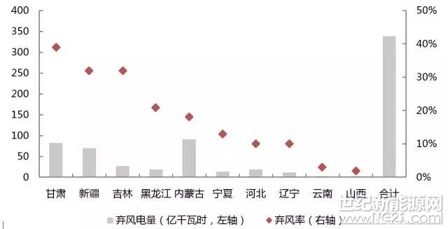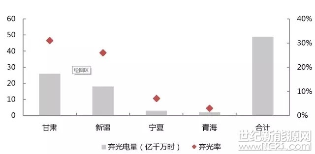 国家能源局发布的《2015年度全国可再生能源电力发展监测评价报告》显示,2015年我国弃风电量339亿千瓦时(图3),同比增加213亿千瓦时,甘肃、新疆和吉林的弃风率均超过30%;西北地区出现了较为严重的弃光现象(图4),甘肃弃光电量26亿千瓦时、弃光率31%,新疆弃光电量18亿千瓦时、弃光率26%。西南地区弃水现象也同样严重,四川弃水电量达到102亿千瓦时,云南弃水电量152.6亿千瓦时。据此推算,2015年我国至少有642亿千万时的可再生能源没有利用。如这些可再生能源用来电解制氢,则可以制备160.5亿立方米的氢气(按照制备每立方米氢气耗费4度电来计算)。