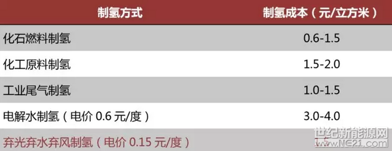 目前弃光、弃风和弃水发电的成本价格为0.15元/度,据此计算出的电解水制氢成本为1.5元/立方米,这已经远低于利用上网电电解水制氢的成本,且与化石燃料(煤、焦炭和天然气)制氢的成本上限接近(表1)。所以,未来氢能产业链下游储运等环节一旦取得突破,新能源支持的大规模电解水制氢的市场份额将出现增长,氢能成本也会进一步降低。