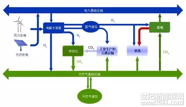 一是通过发展电转气(P2G)可实现可再生能源补充发电。目前风能和太阳能等可再生能源发电的难点在于发电的波动性。波动的可再生能源使发电高峰和用电高峰产生错配,造成并网困难。但如果波动的可再生能源先转化成氢能储存起来,在用电高峰时,再转化为电能,就可实现可再生能源补充发电。