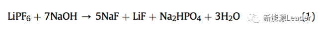 XueleiLi等首先降废弃的磷酸铁锂电池进行了放电和拆解,残余的电解液利用低浓度的NaOH进行了处理,根据电解液中溶剂不同的密度、溶解性和沸点等物理特征实现了对DMC、DEC和EC等的分离,溶剂盐LiPF6则会在水溶液中发生分解,如下式所示,然后可以通过过滤对其进行回收。