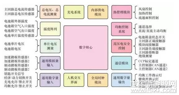 BMS软硬件的基本框架如图2所示,应该具有的功能:1)电池参数检测。2)电池状态估计。3)在线故障诊断。4)电池安全控制与报警。5)充电控制。6)电池均衡。7)热管理。8)网络通讯。9)信息存储。10)电磁兼容。