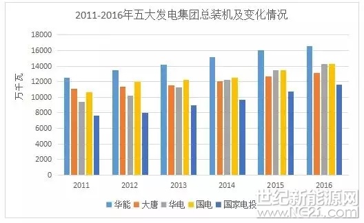 在规模扩张战略引领下,五大发电组建15年来,装机规模大幅增长。2002年组建时五大发电集团装机容量合计12067万千瓦,占全国总装机容量的34%。2016年,五大发电集团装机容量合计69811万千瓦,是组建时的将近六倍,占全国总装机容量达到42%。