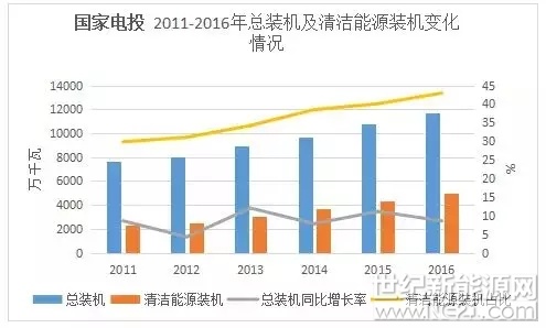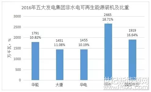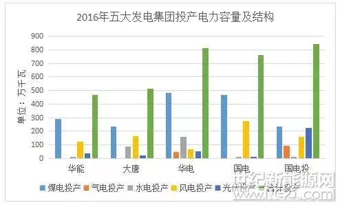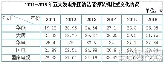 在战略执行中,五大发电除了投资向新能源倾斜外,还相继成立新能源股份公司,对新能源产业给予充分的、实质性的支持,以谋求做强做大。截至2016年底,华能集团清洁能源装机占比达到29%,大唐集团清洁能源占比31.76%,华电集团清洁能源装机占比达到37%,国电集团清洁能源占比达30.3%,国家电投清洁能源比重达到42.9%。