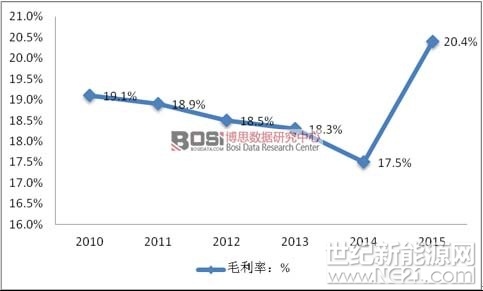 2014年,我国储能行业毛利率为17.5%,2015年,我国储能行业毛利率为20.4%,同比上升2.9个百分点。