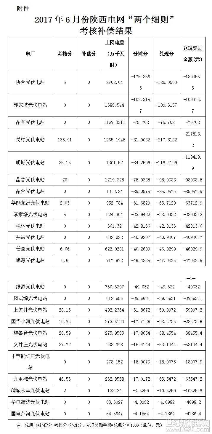 根据《关于印发<西北区域发电厂并网运行管理实施细则>及<西北区域并网发电厂辅助服务管理实施细则>的通知》(西北监能市场〔2015〕28号)规定,2017年6月份陕西电网发电厂并网考核和辅助服务补偿结果完成复核工作,现予公布,请依据附件结算。