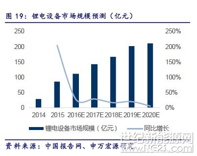 据预测,假设动力锂离子电池实际产能利用率为55-70%,消费和储能锂电产能利用率90%,到2020年我国锂离子电池产能预计将超过270GWh。假设每GWh的动力锂电池产能对应的总投资约6亿元,其中设备投资占比65%,而国产设备占比到2020年有望提升到100%,则每GWh产能释放对应的国产设备投资约3.9亿元,预计2020年我国锂电设备规模约210亿元。