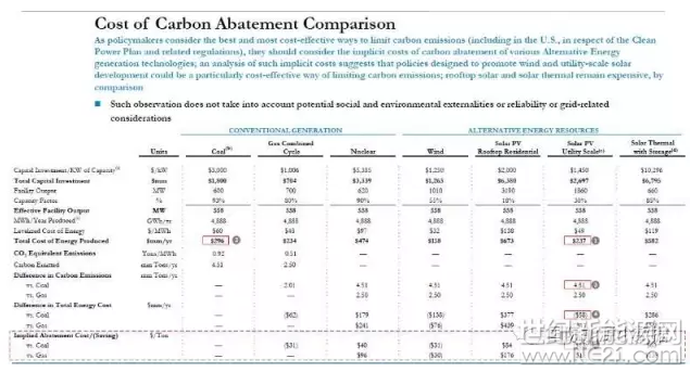 大型地面光伏:煤电每千瓦投资1450美元,全周期度电成本为4.9美分/千瓦时,碳排放不计;相对煤电减排无额外成本,每吨碳排放“净赚”13美元。