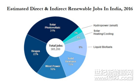2016年,印度可再生能源装机容量占全球总量的5%,投资总额达到97亿美元,直接和间接从事可再生能源领域的人员达到830万人,与中国、巴西、美国、日本和德国一样成为全球领先的可再生能源就业市场。