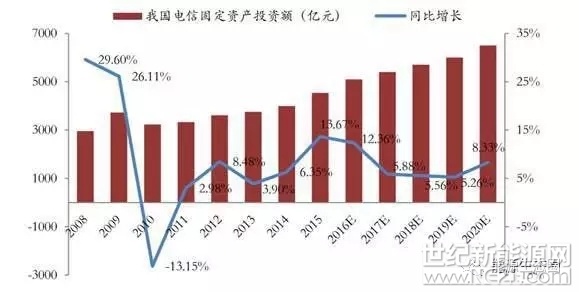 受益于 3G、4G 网络建设的刺激因素下,电信固定资产投资 规模增速明显上升,未来在 5G 建设的带动下将继续保持平稳增长。按一般通信基站的配置要求,后备电源需求大约 占总投资的 2%~3%,预计“十三五”期间后备电源市场规模有望超过 500 亿元,一方面通过改造后备电源系统增 加其储能功能,盘活存量市场,另一方面通过设计一体化集成方案,开拓新增市场,更大程度地为客户实现节能套利。