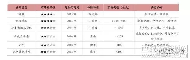 目前最具市场经济性的是传统电网削峰填谷,已经可以实现无补贴的商业化推广,若“十 三五”期间在大型工业城市投资储能项目,则市场规模有望达到 1500~2400 亿元,此外,未来若在大型工业省份全面 推广储能,则市场规模更可观;后备电源及 UPS 储能也不需要补贴,市场规模约为 1000 亿元;新能源发电可按一定 比例配套储能,市场规模约为 255 亿元,但尚需补贴;另外,户用储能和充储放一体化充电站等市场规模不到 100 亿 元,且需要补贴才能推广。综上所述,传统电网削峰填谷将是未来五年最大的储能市场。