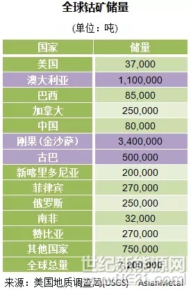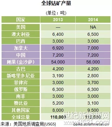 据美国地质调查局2015年数据显示:2014年全球钴矿产量为11.2万吨,2013年为11万吨。刚果(金)拥有丰富的钴资源储量,钴矿产量也高踞第一位,占全球总量的一半。其他产量较高的国家还有:中国(7200吨);加拿大(7000吨);澳大利亚(6500吨);俄罗斯(6300吨)等。