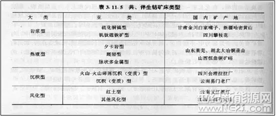 共、伴生钴矿床的分类一般服从于主矿。国内目前现有的钴矿按矿床成因可分为四大类,即岩浆型、热液型、沉积型和风化型矿床。四大类按工业类型又可分为九个亚类。