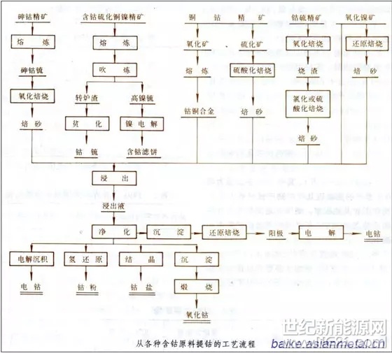 从含钴黄铁矿中提取钴:含钴黄铁矿经浮选可产出含钴0.3%~0。5%的钴硫精矿。钴硫精矿经硫酸化焙烧,使精矿中的钴,镍,铜等有价元素转变为可溶性的硫酸盐。焙砂用水浸或酸浸使钴,镍,铜等转入溶液。浸出液经净化除杂除去铁,铜,锌,锰等杂质,再经镍钴分离得到纯净的钴溶液,电积生产金属钴。