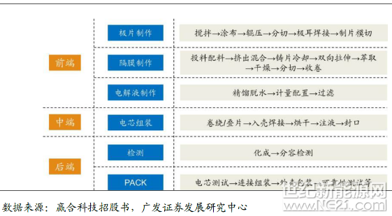 锂电池的生产工艺比较复杂,大致可分为极片制作、电池单元(电芯)制作和电池组装三个工段。锂电池极片制作工艺包括电极浆料制备、电极浆料涂布、辊压、分切、极耳焊接等工序;锂电池电芯制造工艺主要包括卷绕或叠片、入壳封装、注入电解液、抽真空并封装等;电池组装工艺主要包括化成、分容、组装、测试等。
