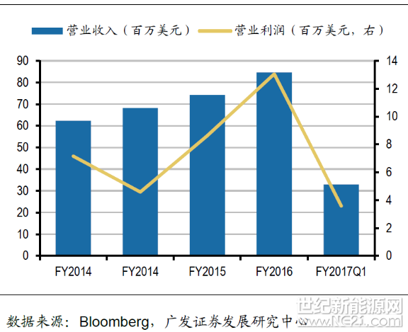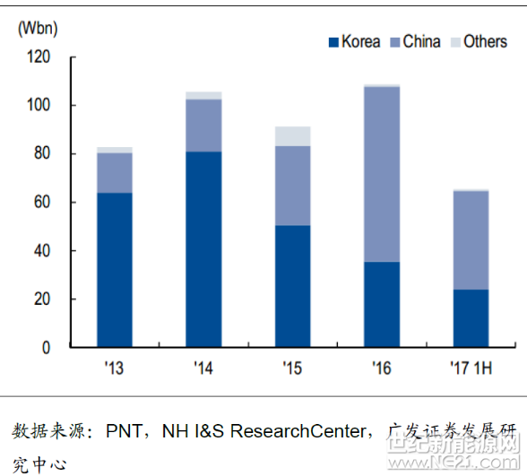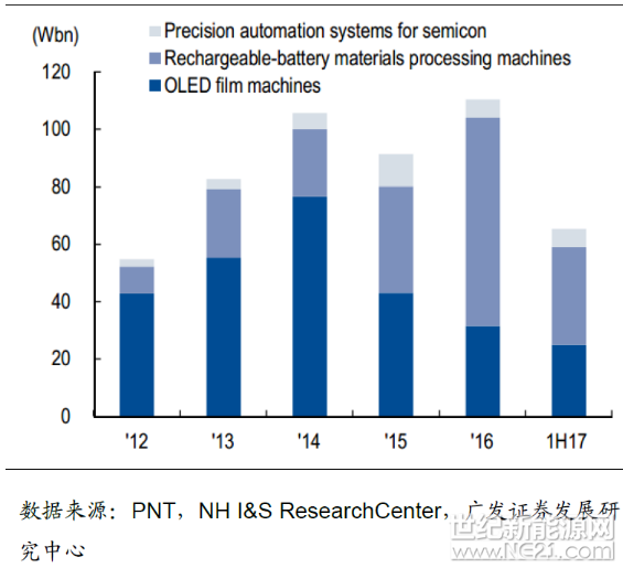 韩国以及全球新能源汽车的发展带动了韩国三星SDI、LG化学等动力电池企业的繁荣,作为三星SDI、LG化学等优质动力电池企业锂电设备的供货商,PNT锂电设备业务营业收入快速增长。从PNT营业收入的地区分布来看,中国市场对业绩的贡献逐年增大,并在2016年首次超过韩国本土。受益新能源汽车中国市场的发展,2017年上半年,PNT中国市场的营收占比进一步扩大,达到了61.9%。