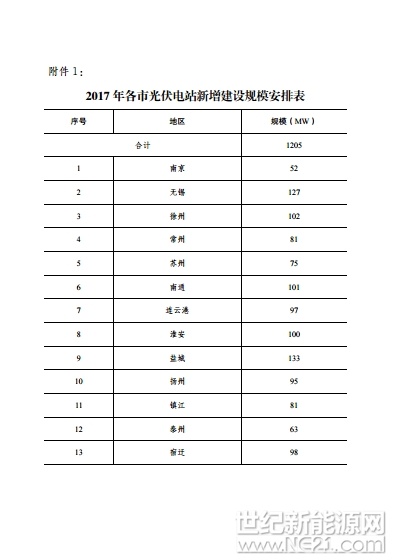 江苏省发改委下达2017年度光伏电站新增建设规模和组织编制实施方案