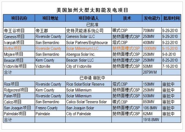 全球最大的太阳能发电厂就落户在了加州的布莱斯(Blythe)。今年9月15日,该太阳能发电项目获得加州能源委员会(the California Energy Commission)的正式批准。布莱斯太阳能发电项目由德国Solar Millennium和雪佛龙(CVX,85.15,+0.33%)公司旗下的Chevron Energy Solutions共同开发, 4组250WM的独立发电单元形成了高达1000MW(1GW)的设计发电量,总造价预计将超过60亿美元,其中第一组发电单元将于2013年投入运行。