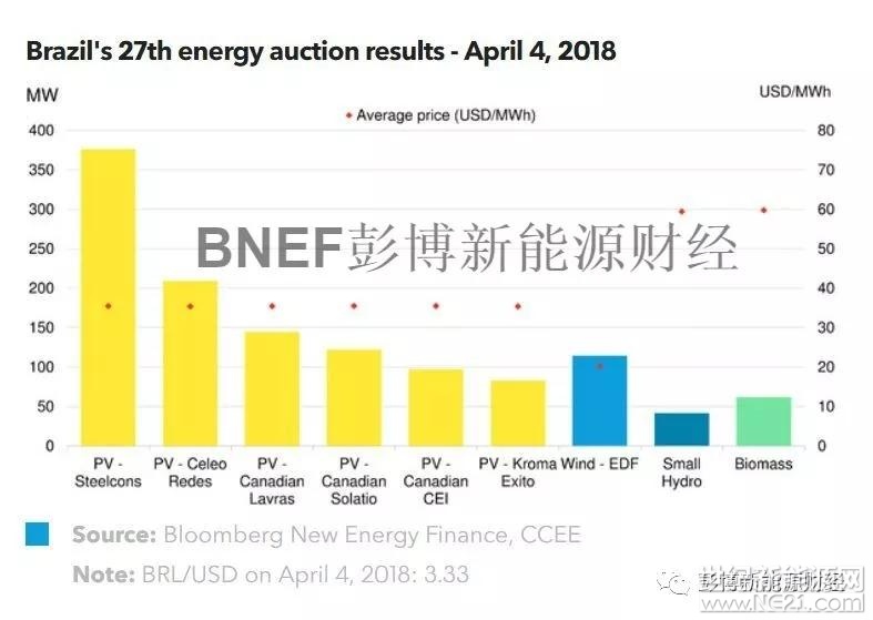 4个风电项目的平均成交价也仅为67.6雷亚尔/MWh(20.3美元/MWh),创下该国历史新低。
