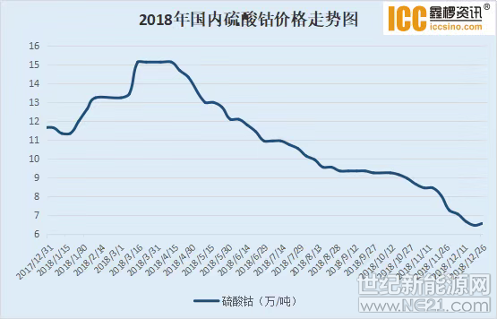 受金属原材料价格下滑的影响,近几个月来硫酸钴价格也一路跟跌,下滑至7万/吨以下。然而在12月底钴价跌势未改的情况下,硫酸钴价格却走出了小幅回升的行情。当前市场上硫酸钴价格报在6.6万/吨附近,较此前低位回升了0.1-0.2万/吨。