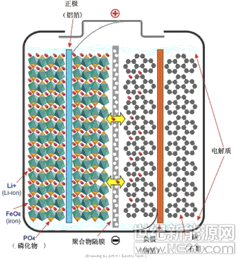 左边是橄榄石结构的LiFePO4作为电池的正极,由铝箔与电池正极端子连接,右边是由碳(石墨)组成的电池负极,由铜箔与电池的负极端子连接,中间是隔膜,它把正极与负极隔开,但锂离子Li+可以通过而电子e-不能通过,电池的上下端之间是电池的电解质,为锂离子运动提供运输介质。