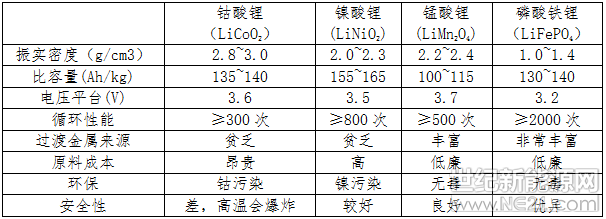钴酸锂(LiCoO2)、镍酸锂(LiNiO2)、锰酸锂(LiMn2O4)、磷酸铁锂(LiFePO4)等正极材料的性能比较详见表1。