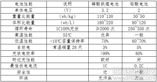 表3 磷酸铁锂电池和铅酸电池性能比较