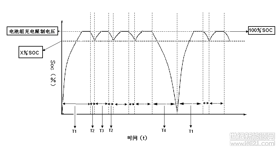 智能间歇式充放电管理分以下两个步骤,如图:恒流-恒压充电阶段:电池组充电电路根据各单体电池的电压进行充电控制,控制电池单体和电池组的充电电压满足充电限制电压要求(充电限制电压:电池单体3.7V,),直到所有电池都充满电;间歇式补充电阶段:电池组完成整个恒流-恒压充电过程后,电池组由BMS控制进入开路静置状态,直至容量减少到电池组充电限制电压初始容量的SOC(其中X取值在75~95之间)时,由BMS控制电池组重新进入补充电状态,补充电方式也遵循恒流-恒压充电方式;在开路静置状态时,若交流电停电,BMS应能控制电池组无延迟进入放电状态(见图4)。