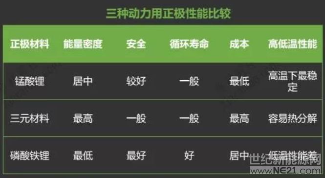 能量密度、成本、安全性、热稳定性、循环寿命是动力锂电池的5个关键指标,三元材料,锰酸钾与磷酸铁锂任何一个在这5个方面都不具有绝对优势,导致动力锂电池极材料路线的差异。