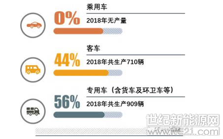 总体来看,2018年国内产出的氢燃料电池车仍以客车和专用车为主,其中客车710辆,专用车909辆,两类车型产量数据占比约为1:1.28。