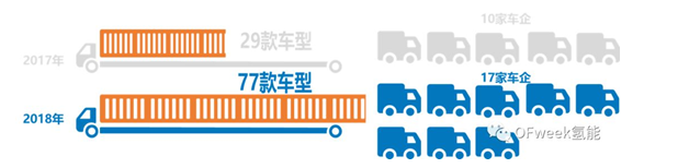2018年工信部发布13批《新能源汽车推广应用推荐车型目录》,其中,有效批次为2018年第5-13批(根据工信部文件,1-4批次作废),共计77款燃料电池车型(筛除重复车型)入选目录,同比增加165%,涉及17家整车生产企业。