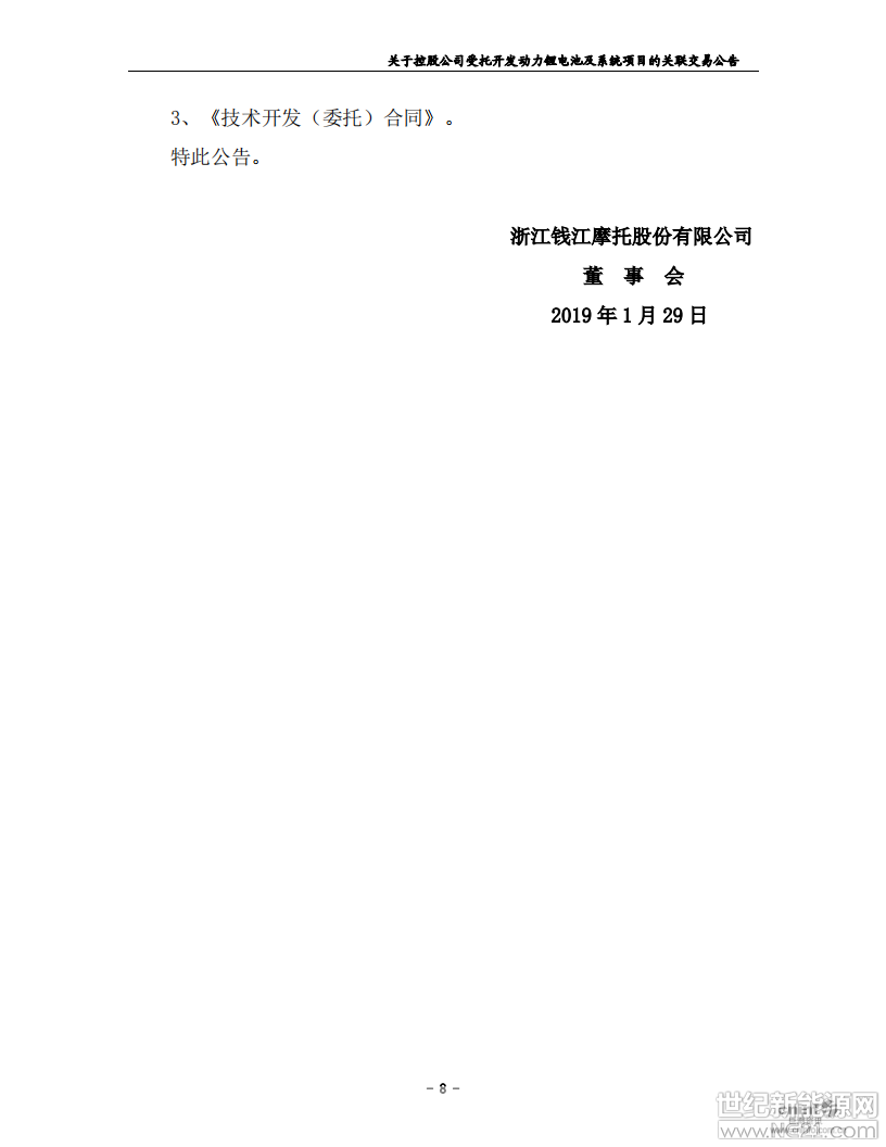 1月28日,钱江摩托发布《关于控股公司受托开发动力锂电池及系统项目的关联交易公告 》,公告称,钱江新能源公司与荆州吉利公司签署了《技术开发(委托)合同》。荆州吉利公司有意让钱江新能源公司成为其电池供应商并将动力电池开发项目委托给钱江新能源公司,合同对价为2892.12万元(含税)。双方的技术合同涉及的项目包括软包三元 50Ah 锂电池、软包三元 37Ah锂电池、软包三元 47Ah 锂电池、48V 启停锂电池及以上锂电池系统的开发。详情如下: