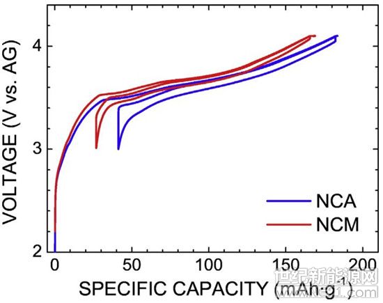 图2.NCA|LiPF6(EC/DEC)|AG和NCM333|LiPF6(EC/DEC)|AG电池充放电曲线。