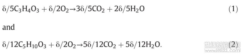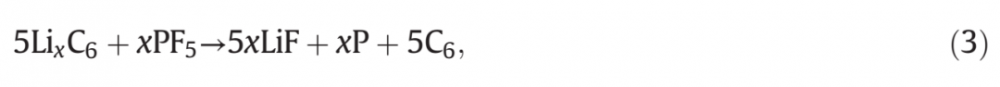 与NCA不同的是,嵌锂石墨在200 ℃以下均未出现显著的产热,只有200 °C ≤ T ≤ 260 °C和T>260 °C才出现显著的产热。其中200 °C ≤ T ≤ 260 °C的产热主要是嵌锂石墨与LiPF6反应,而T>260 °C的产热主要是嵌锂石墨同EC/DEC溶剂反应,反应式分别如下: