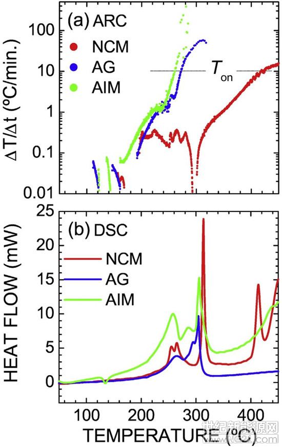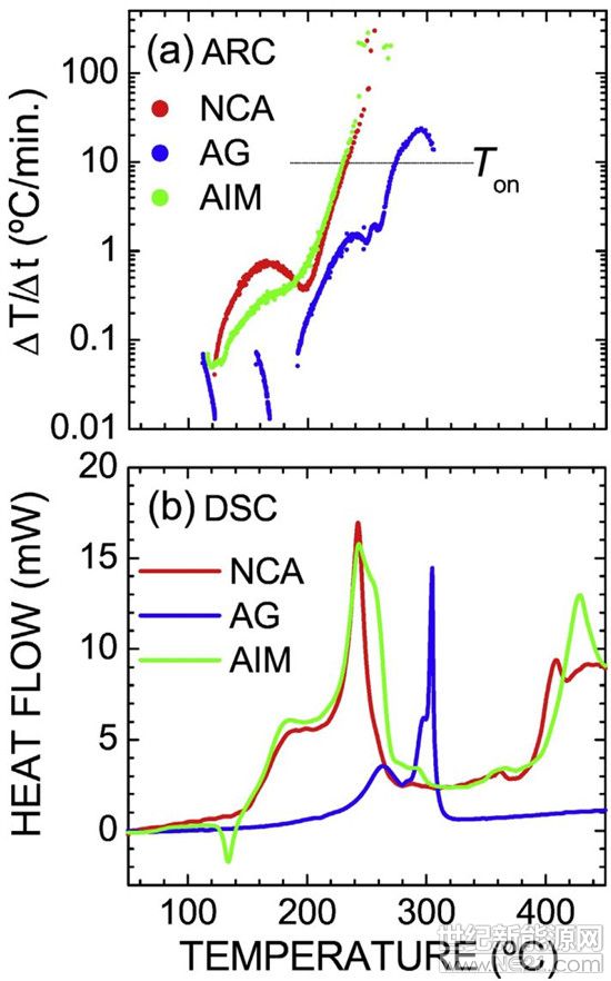 图3.NCA电池体系的ARC测试结果(a)和DSC测试结果(b)。热失控点定义为ΔT/Δt ≥ 10 °C·min-1。