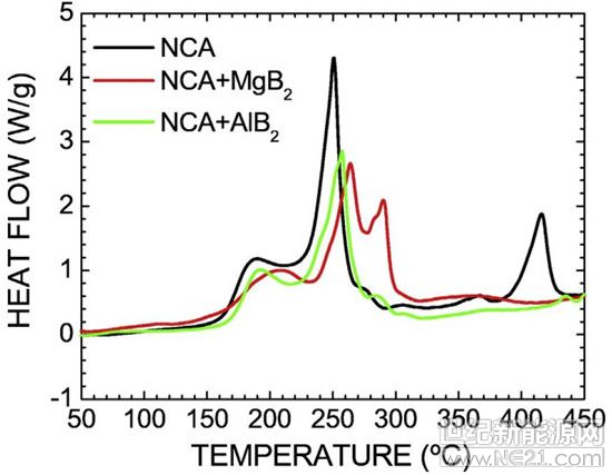 图6.NCA、NCA+MgB2和NCA+AlB2ARC或DSC曲线。注:ARC和DSC测试均在有LiPF6(EC/DEC)电解液存在条件下进行。