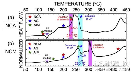 值得注意的是,AIM无论是ARC曲线还是DSC曲线除了在135 ℃出现的由于PE隔膜融化导致的吸热峰外同NCA曲线趋势几乎一致,表明导致NCA电池发生热失控的主因是NCA正极材料本身而不是石墨负极。