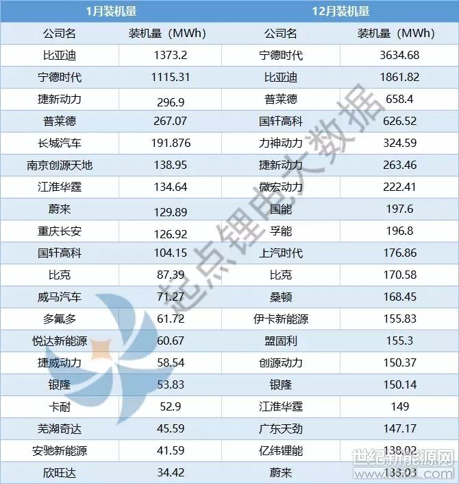 相比12月榜单,1月新进长城汽车、南京创源天地、重庆长安、威马汽车、多氟多、悦达新能源、捷威动力、卡耐、芜湖齐达、安驰新能源、欣旺达等11家。比亚迪以1373.2MWh的装机量位居榜首,宁德时代以1115.31MWh排名第二,上个月排名第八的捷新动力1月以296.9MWh排名第三。名次有所上升的还有江淮华霆和蔚来。