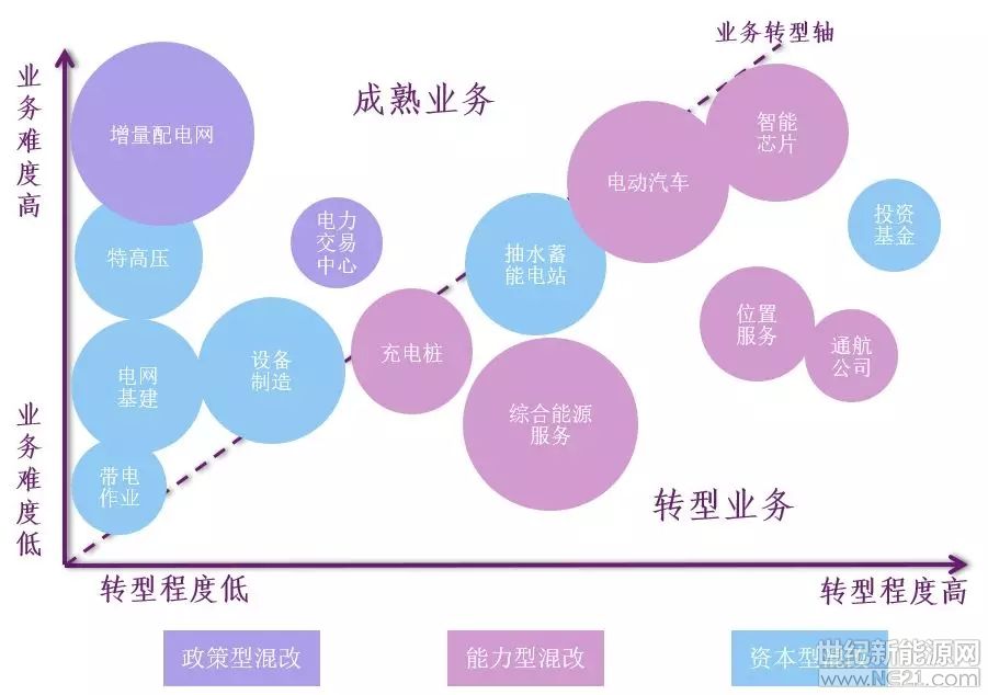 通过对国家电网公司混改的业务领域和潜在市场规模进行了研究,梳理了十四个国家电网公司计划推进及可能推进的混改业务方向。研究发现政策型混改主要集中于电网公司的成熟业务区,能力型混改则更加集中于转型业务区,资本型混改则在两个区域均有分布。这说明了通过混合所有制改革可以确实的助力于国家电网公司达成政策要求和公司战略目标。