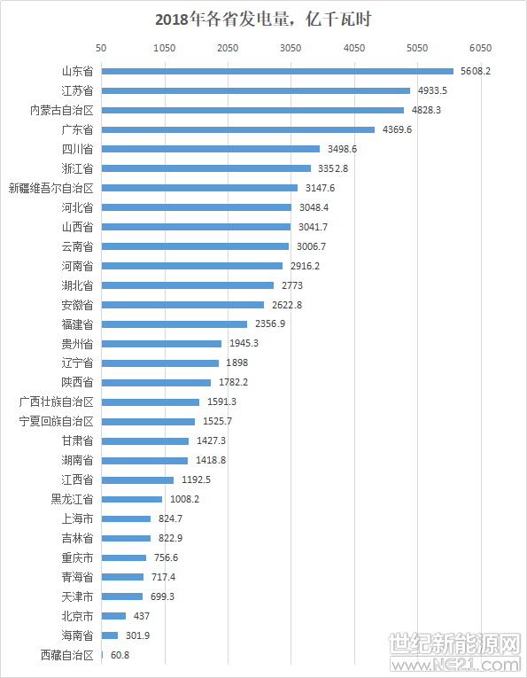 按总量来看,发电量最高的是山东省,2018年累计发电量约为5608.2亿千瓦时;之后是江苏省,2018年全年累计发电量约为4933.5亿千瓦时。且两省主要都是火力发电,占比均超过了90%。