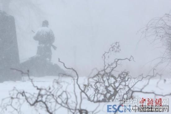 资料图:当地时间2018年1月4日,暴雪中纽约法拉盛公园中的雕塑。当日,纽约降下2018年首场暴雪。受一波被称为“炸弹气旋”的风暴影响,美国东北部地区当天普遍遭受暴雪袭扰,3000多个航班因此取消 中新社记者 廖攀 摄