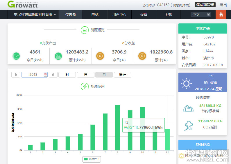 目前已安装两期,建成光伏电站1.4MW,全部为“自发自用,余电上网”模式,组件5500余块,使用古瑞瓦特逆变器,20kw、25kw、30kw、40kw、50kw、60kw合计30余台。电站于17年7月和18年7月分两批并网,累计发电量1203483.6kwh,平均电价0.85元/wh,收益约1022960元,节约标准煤481393.3kg,CO2减排1199872.8kg。借助绿色环保新能源科技力量,利用闲置屋顶资源实施分布式光伏发电,推进节能减排,惠博新材料将从源头上减少城市污染气体的排放,加快改善环境空气质量,可进一步保护山东生态环境,为建设生态山东、美丽山东贡献力量,助力打赢蓝天保卫战。