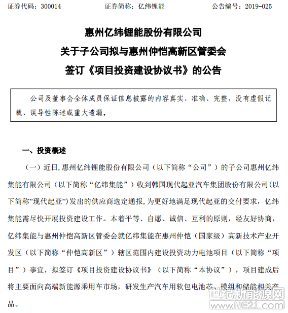 根据公告,亿纬锂能的子公司惠州亿纬集能有限公司近日收到韩国现代起亚汽车集团股份有限公司发出的供应商选定通报,为更好地满足现代起亚的交付要求,亿纬集能需尽快开展投资建设工作。因而亿纬集能与惠州仲恺高新区管委会就亿纬集能在惠州仲恺(国家级)高新技术产业开发区(“仲恺高新区”)辖区范围内建设投资动力电池项目事宜,拟签订《项目投资建设协议书》,项目建成后将主要面向高端新能源乘用车市场,研发生产汽车用软包电池芯、模组和储能相关产品。项目全部建设并达产后,汽车软包电池芯、模组和储能相关产品产能不低于5.8GWh。项目计划固定资产投资总额约为30亿元人民币,且亿纬集能确保固定资产投资总额不低于20亿元人民币,总建设期不超过3年(自项目建筑工程施工许可证颁发之日起计)。