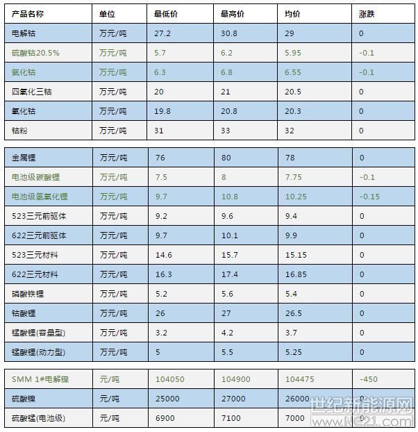 储能材料丨3月11日钴锂镍锰最新价格 氯化钴跌1000元/吨