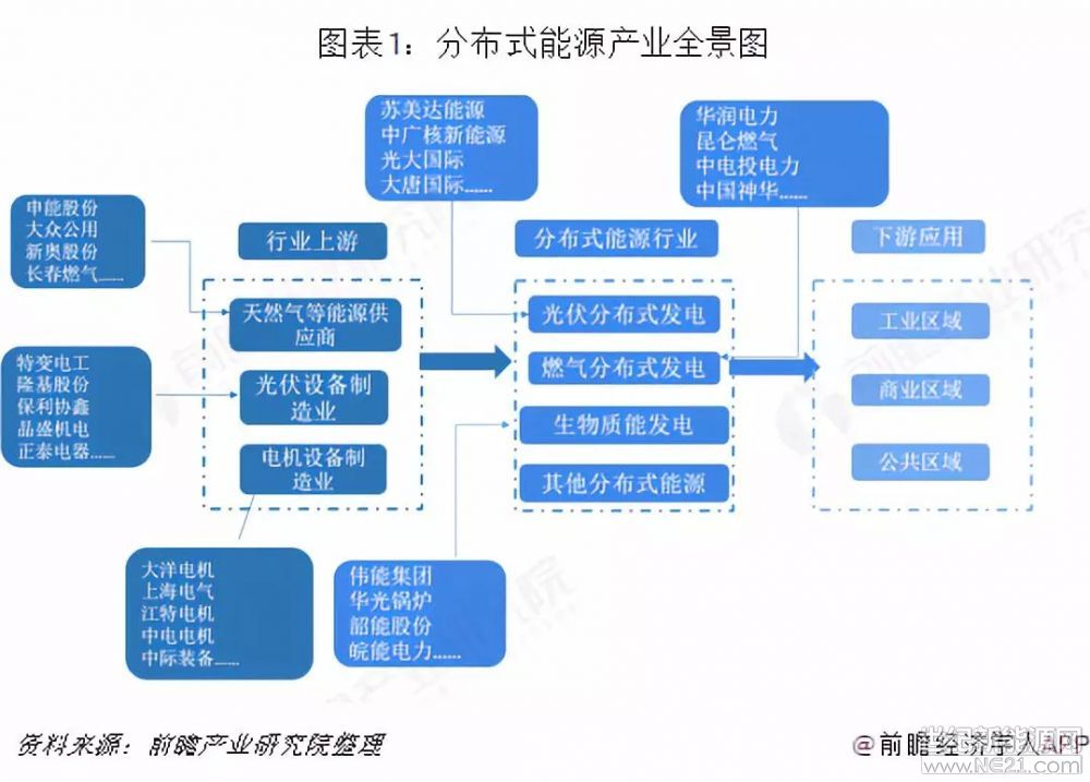 从产业链角度来看,分布式能源由于涉及多种发电方式,因此产业上游涉及行业较多,天然气分布式发电涉及天然气及其他能源行业;光伏分布式发电涉及光伏设备制造行业;分布式能源整体涉及电机设备制造行业等。分布式能源中游行业可以按照发电方式的不同分光伏分布式发电、天然气分布式发电、生物质能发电以及其他分布式发电。分布式能源下游应用主要是产生的能源应用领域,包括工业区域的自发自用、民用区域的结余售电,以及商业区域和公共区域的分布式能源项目等。