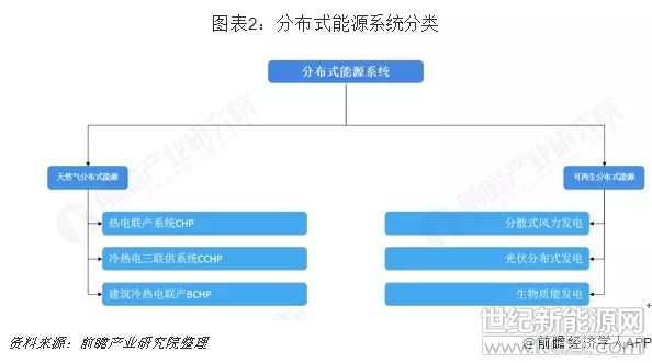 在我国分布式能源系统结构中,主要由两部分组成,分别是天然气分布式能源以及可再生分布式能源,其中天然气分布式能源根据联产系统的不同可以分为热电联产系统CHP、冷热电三联供系统CCHP和建筑冷热电联产BCHP;可再生分布式能源根据供能主体的不同可以分为分散式风力发电、光伏分布式发电和生物质能发电等。