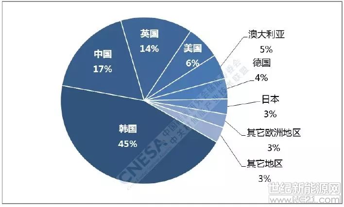 其中,根据中国能源研究会储能专委会/中关村储能产业技术联盟(CNESA)全球储能项目库的不完全统计,韩国、美国、中国、英国、日本、德国和澳大利亚这七国,占据了2018年全球新增电储能市场的94%。纵使放到2000—2018年这个时间纬度上,这些国家同样占据了94%的市场版图。