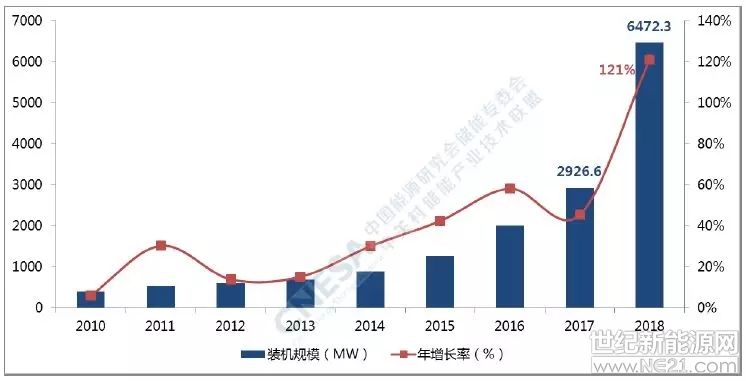 图2:全球已投运电化学储能项目的装机规模(2010-2018)