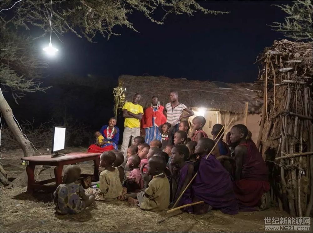 图为双登在非洲的一个户用分布式光伏储能项目,附近原住民在收看电视节目。