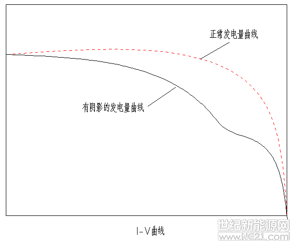 当阴影遮挡面积较大时:旁路二极管导通,组串的电压降低,电流稍微升高,但仍比正常的低。