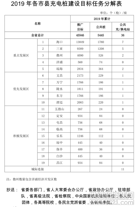 (四)2019年上半年印发实施《海南省电动汽车充电基础设施专项规划(修订)》和《关于进一步加快推动充电基础设施建设的指导意见》,重点明确各领域充电桩建设任务、责任部门及责任单位,确保2019年全省建设各类充电基础设施和建设充电接口40000个以上。(牵头单位:省发展改革委;责任单位:省住房城乡建设厅、省交通运输厅、省机关事务管理局、省国资委、省旅游和文化广电体育厅、省教育厅、省卫生健康委、各市县政府;完成期限:2019年12月)